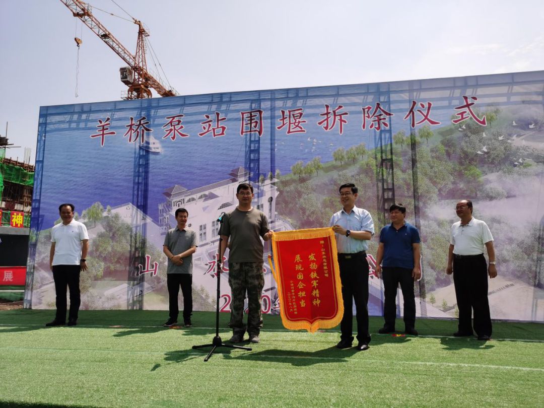 羊桥泵站闸门完全具备了启闭功能,水泵具备了排水功能,围堰的拆除标志着羊桥泵站的正式启用,为今年防汛防潮排涝提供了工程保障,对保证羊口镇人民生命财产安全具有重要意义。仪式上,王法顺部长代表工程指挥部给中国电竞官方网授予了锦旗,表达了对中国电竞官方网领导及参建职工的感谢,赞扬了水总人自强不息、勇于超越的铁军精神。