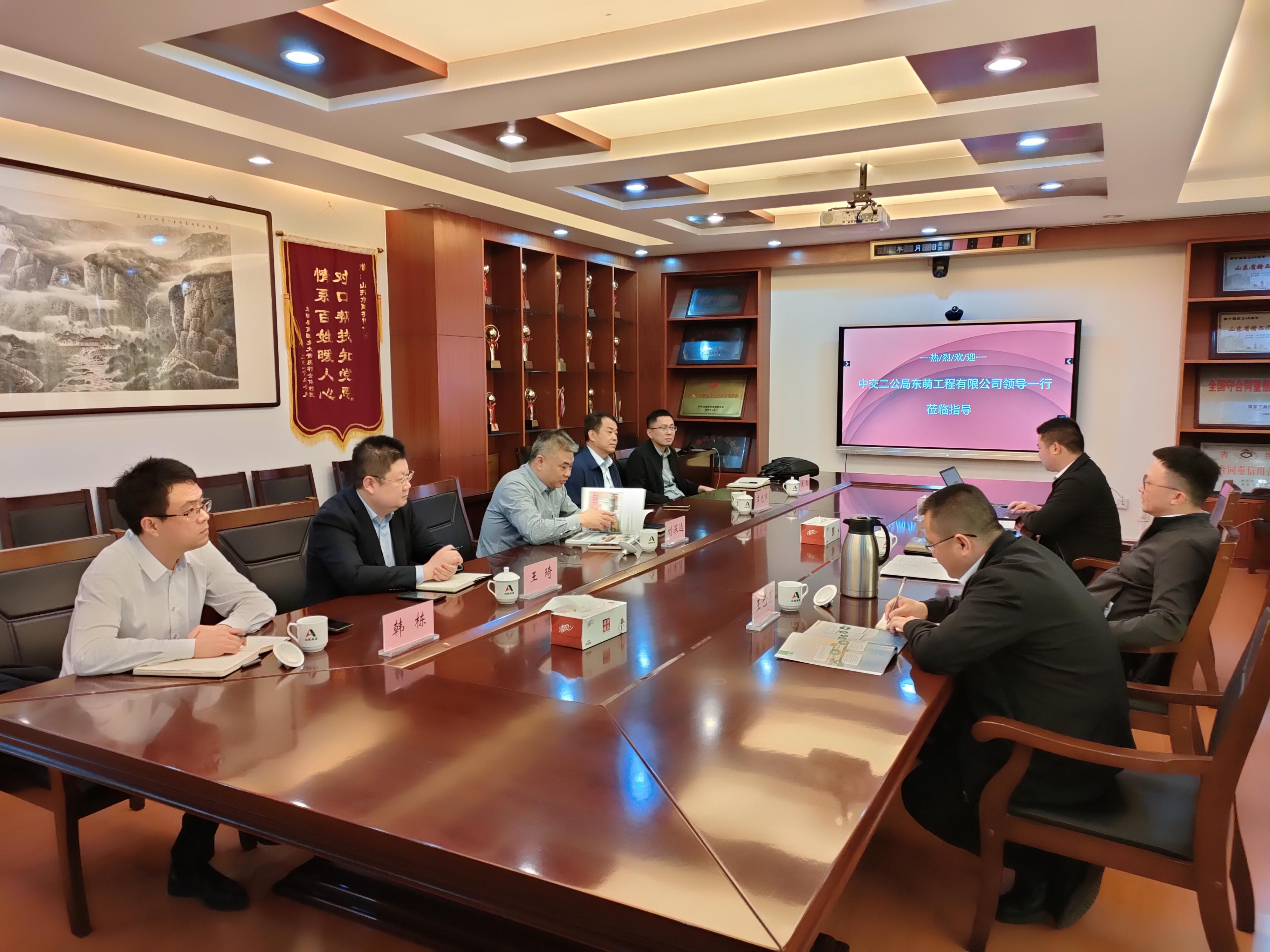 3月20日下午,中交二公局东萌工程有限中国电竞官方网董事长周军、副总经济师王巴图、经营开发部程勇一行到我中国电竞官方网走访交流。中国电竞官方网党委书记、董事长刘深远,党委委员、副总经理李光市出席会议,投资经营部及第七分中国电竞官方网相关人员陪同交流。