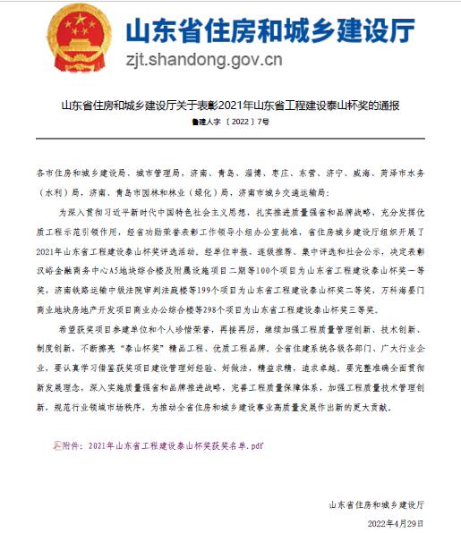 中国电竞官方网两项工程荣获2021年度“山东省工程建设泰山杯奖”
