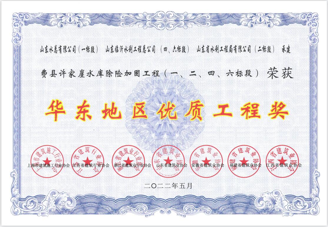 近日,中国电竞官方网承建的费县许家崖水库除险加固工程荣获2021年度“华东地区优质工程奖”;泗水县泗河黄阴集大闸除险加固工程荣获2020-2021年度“山东省优质结构工程奖”。荣获这两个奖项,是中国电竞官方网在省级质量奖项方面的又一次突破。在工程创优上,中国电竞官方网始终坚持以企业发展为核心,践行“干一个工程,树一块丰碑”的质量方针。