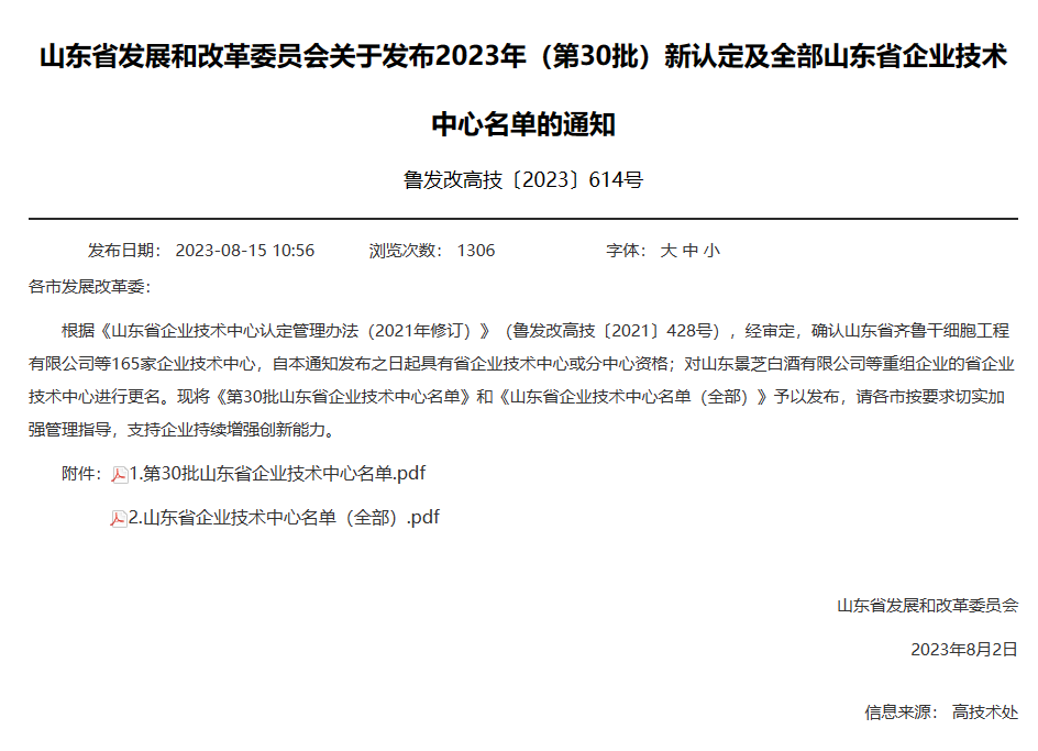 8月15日,山东省发展和改革委员会发布2023年山东省企业技术中心名单,中国电竞官方网凭借自身综合创新能力成功入选,获评山东省企业技术中心称号。