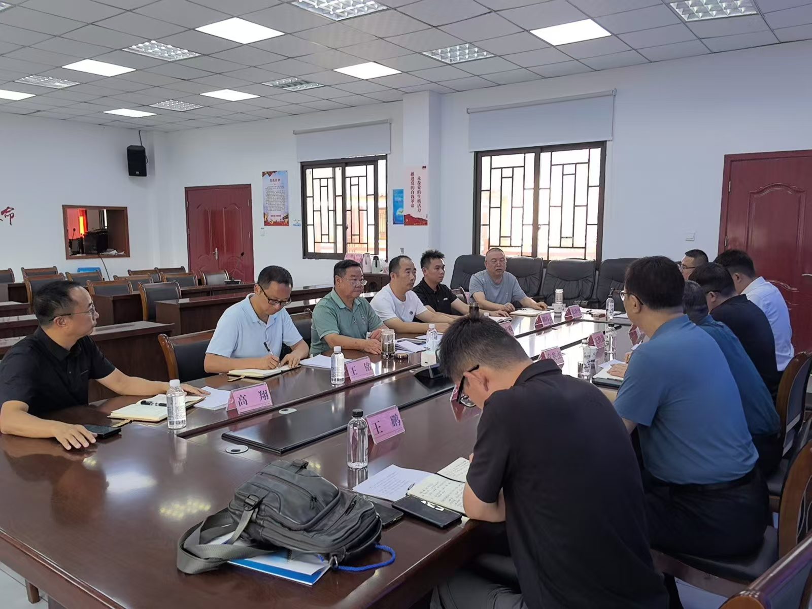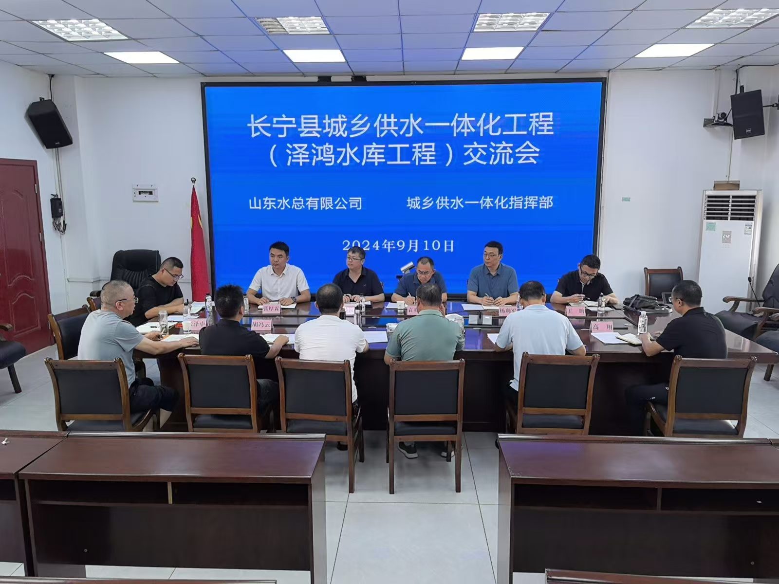 何贵生代表长宁县政府对袁英杰一行表示欢迎,对山东水总参与、支持长宁县基础水利设施建设表示感谢。何贵生从工程总体概况、建设要求及地方文化等方面对长宁县城乡供水一体化工程和泽鸿水库项目进行了整体介绍。袁英杰感谢长宁县政府、县水利局一直以来对山东水总支持和信任,详细介绍了山东水总发展历程、主要工程业绩等情况,并表示将继续发扬创精品工程的优良作风,保质保量完成项目建设,做到干一个工程、树一座丰碑、开辟一片市场。双方就现场征迁、施工工艺、过程控制等方面进行了交流。