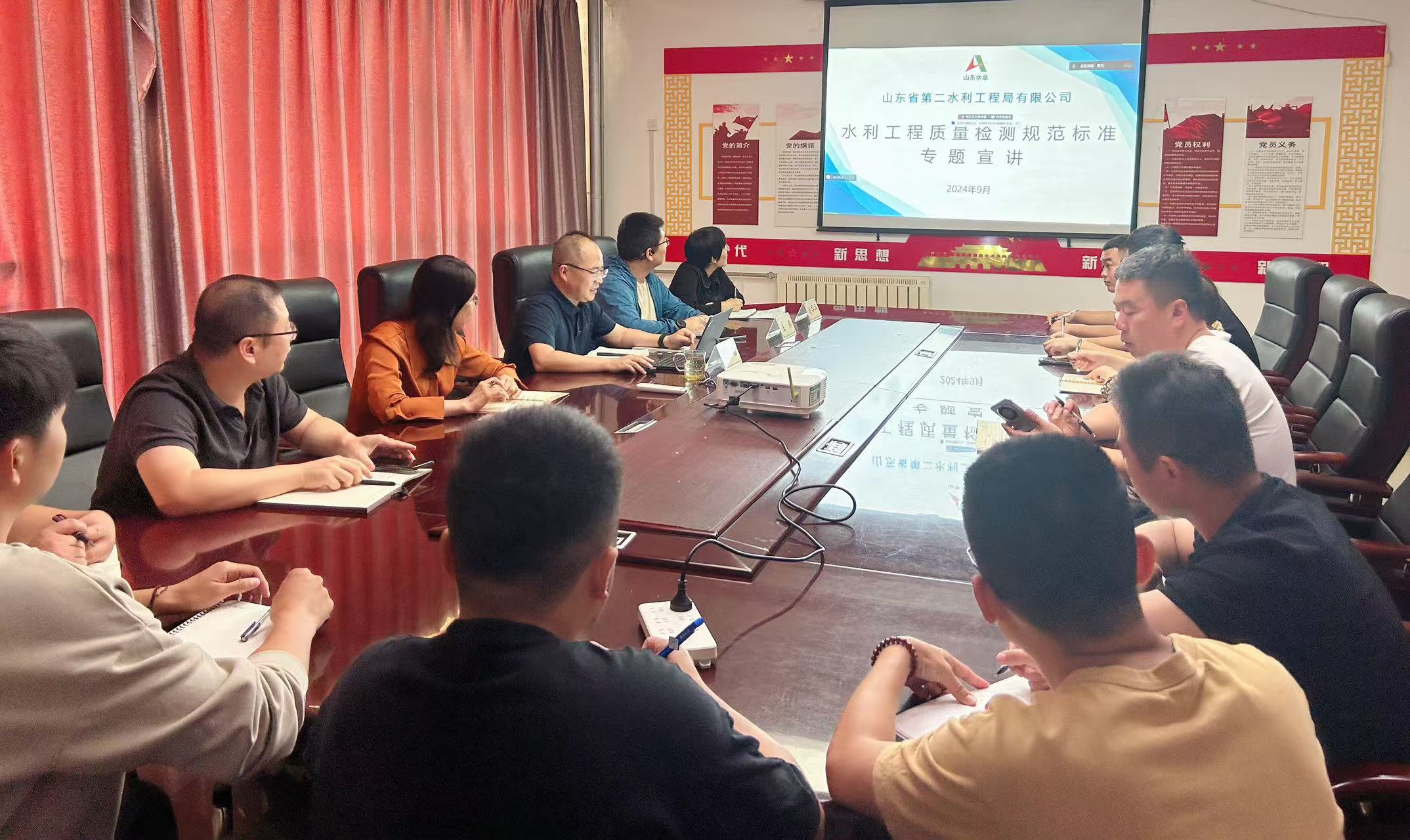 会议中,中心试验室副主任闫磊从试验检测的意义、检测法律法规、检测规范、水利工程检测类别和项目、常见试验取样标准等多个方面进行了深入的讲解,为参会人员带来了一场全面而专业的知识分享。