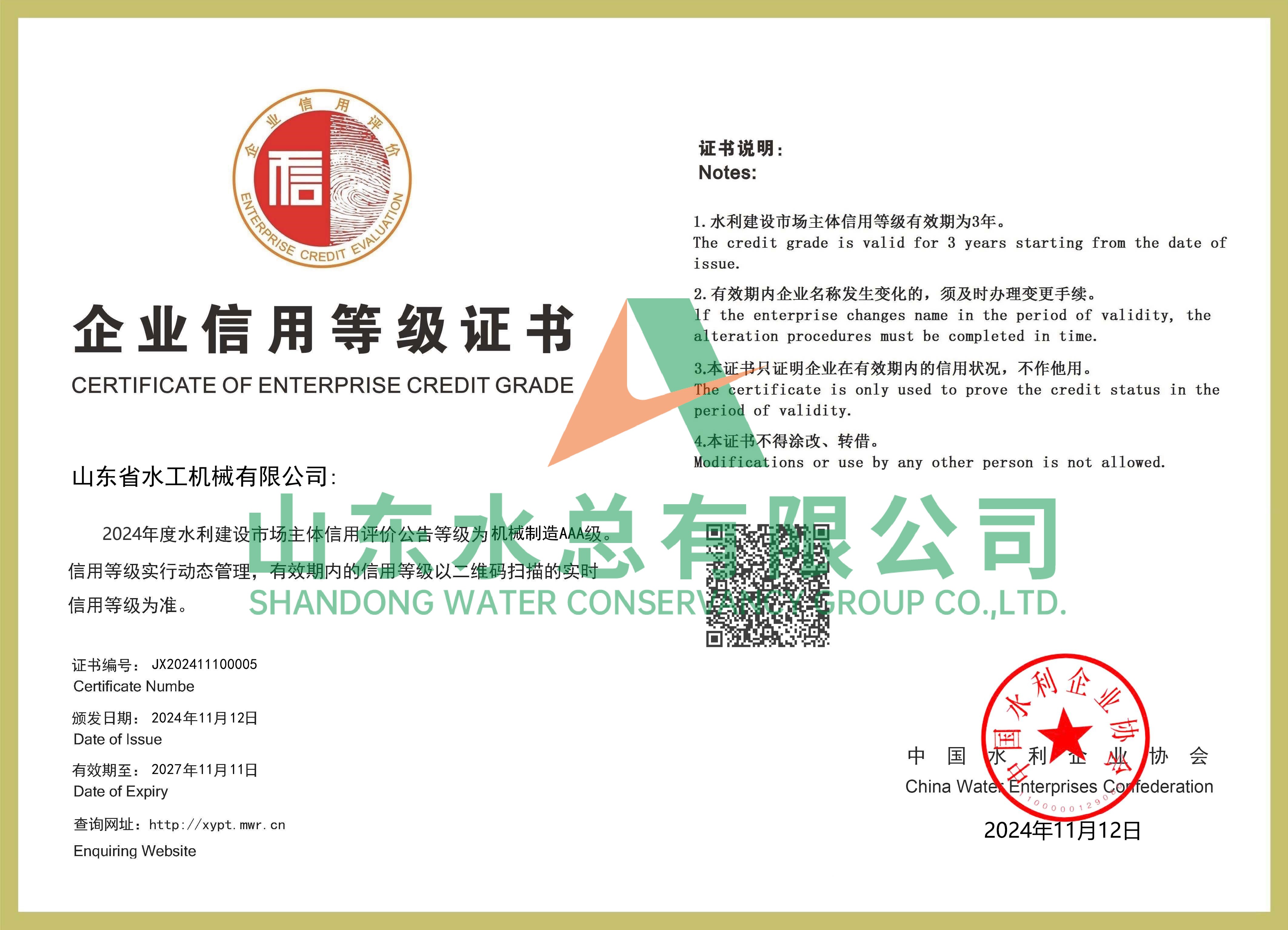 水利建设市场主体信用评价是水利部规范水利建设市场主体行为、加强行业自律的重要手段,其中“AAA”级为水利企业的最高等级信用状况,是衡量企业履约能力、投标信誉的重要因素,是企业综合竞争力最有力的证明。该荣誉的获得,是对水工机械中国电竞官方网诚信经营、质量品牌和服务的高度认可,对于中国电竞官方网大力开拓市场、提高市场竞争能力、推进企业高质量发展具有重要意义和推动作用。