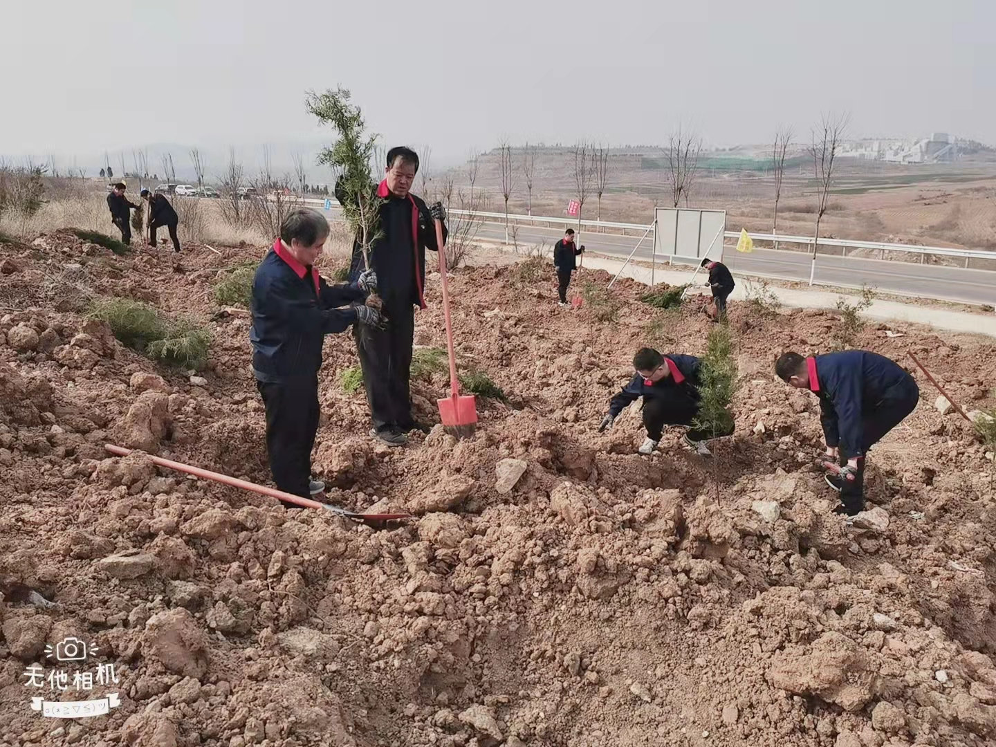 植树活动现场,三、五人为一组分工合作,有的挥锹铲土、有的扶树填土,配合默契,场面繁忙有序。党员志愿者们积极踊跃参与,以饱满的热情投入到“播绿添彩”行动中。经过一番辛勤劳作,新栽种的树苗在上坡山构成一道靓丽的风景线。