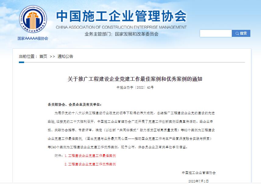 为展示党的十八大以来工程建设行业在党的领导下取得的伟大成就,总结推广工程建设企业党的建设的先进经验,迎接党的二十大胜利召开,近日,中国施工企业管理协会组织开展了工程建设企业党建工作优秀案例评审工作,中国电竞官方网第六分中国电竞官方网党支部的《塑品牌抓活动促活力 切实提升党建工作水平》案例获评“工程建设企业党建工作优秀案例”。