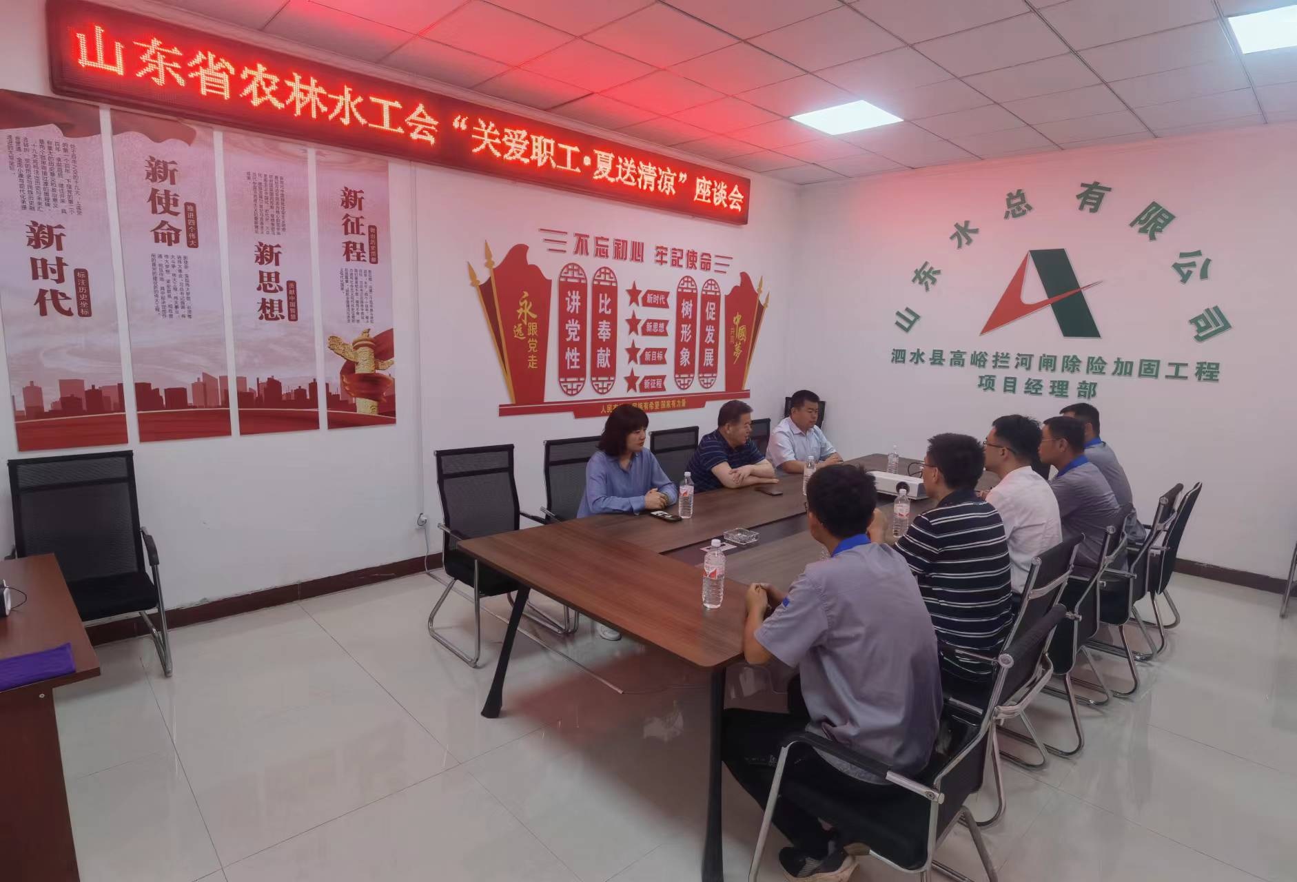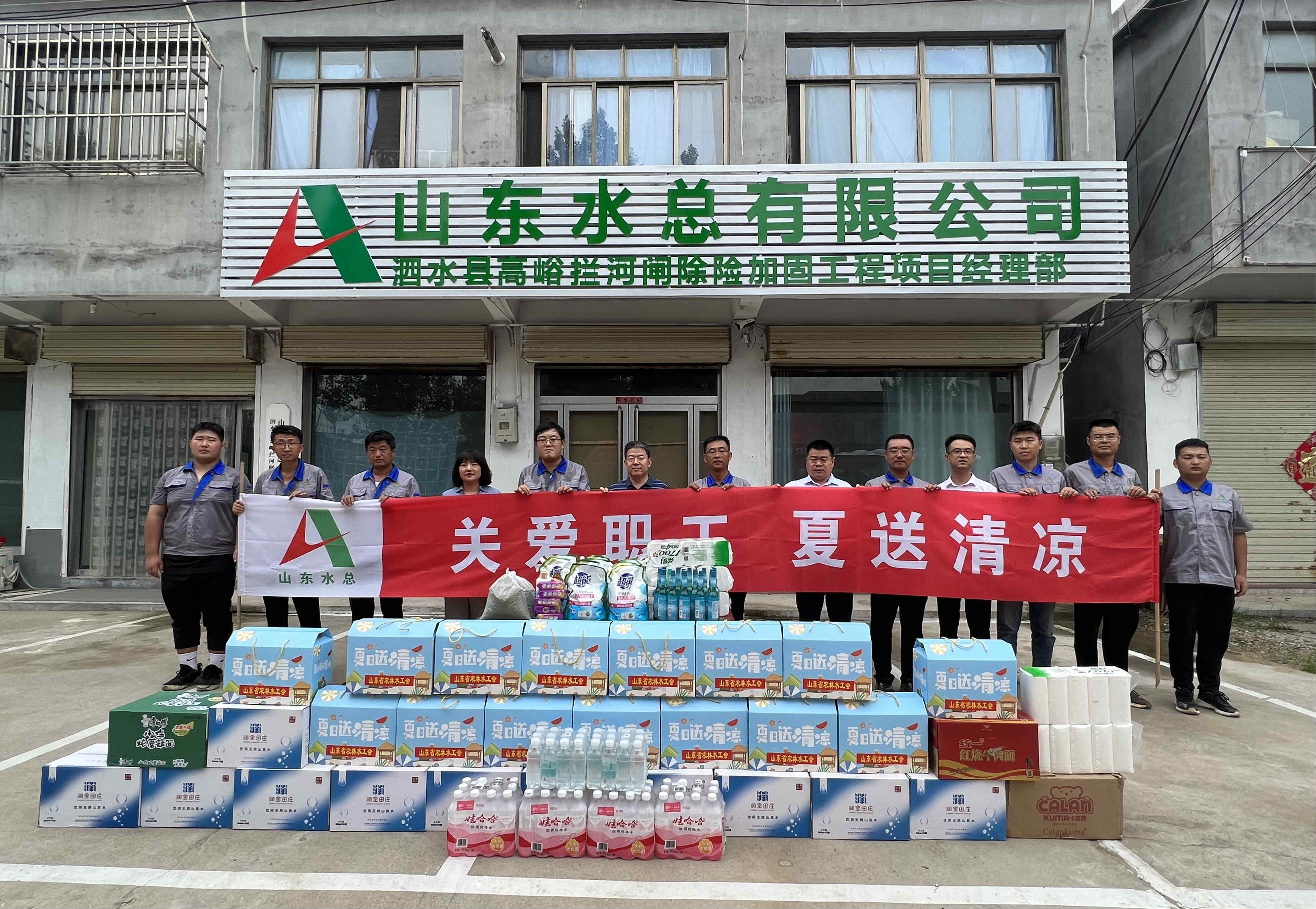 7月19日,山东省农林水工会主席张志刚一行到中国电竞官方网泗水县高峪拦河闸除险加固工程开展“夏送清凉”慰问活动。中国电竞官方网党委副书记、工会主席周少林,党委组织部部长孙凌,第七分中国电竞官方网总经理韩栋,副总经理常征陪同参加慰问。